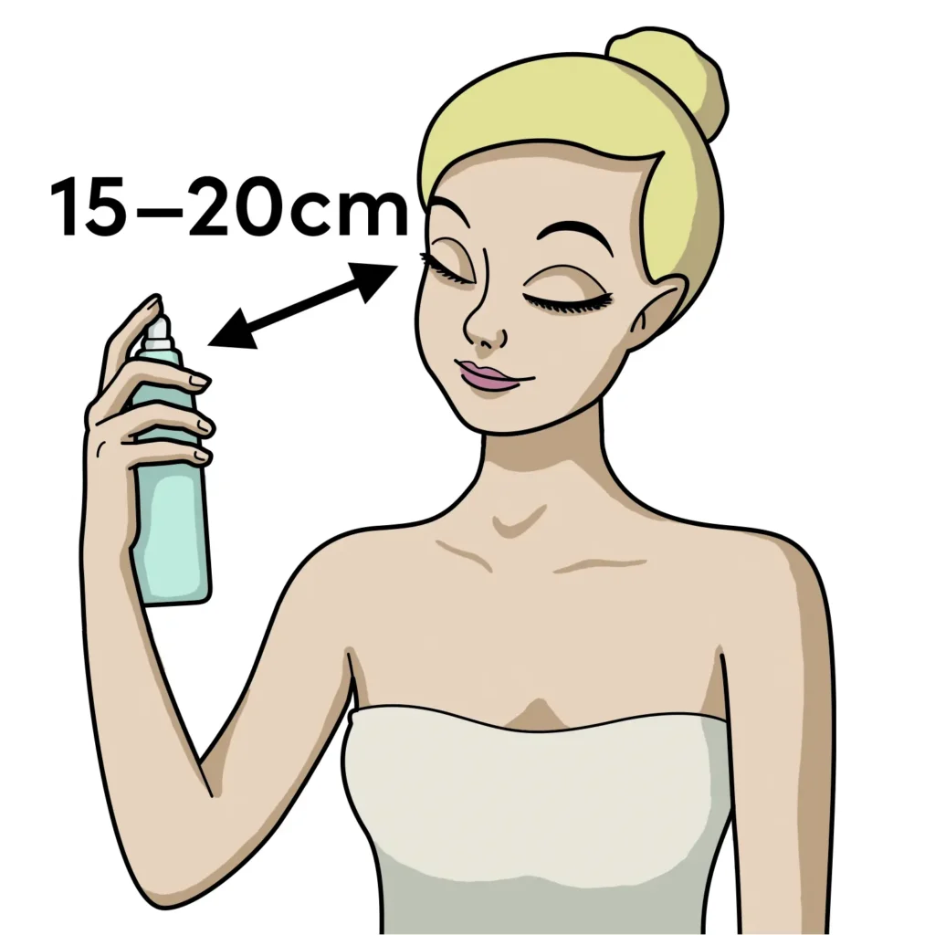 2. Hold the bottle 15–20 cm away from your face. Spray evenly across the skin, keeping eyes closed.